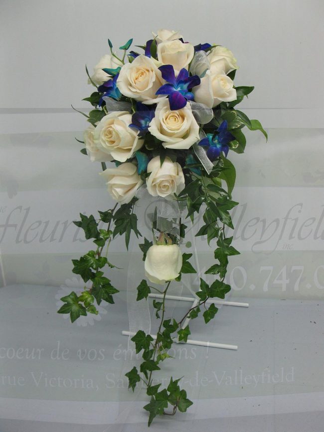Bouquet de mariée en cascade composé de roses et d’orchidées.