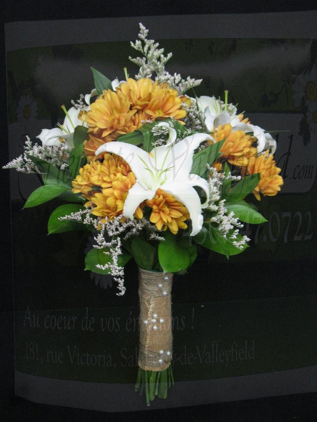 Bouquet de mariée en chrysanthèmes, lys et caspia.