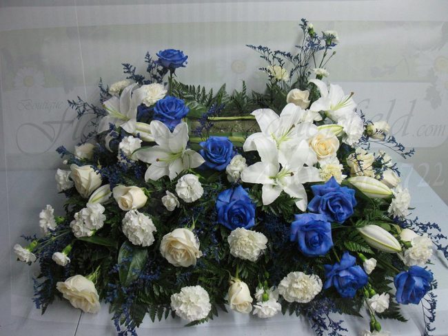 Coussin d’urne composé de; Lys blancs Roses bleues Roses blanches Œillet blancs Caspia