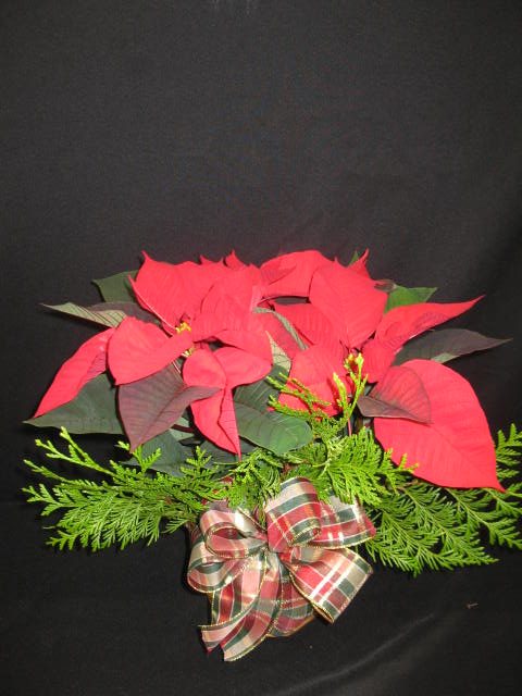 Poinsettia 6 pouces agrémenté de pommes de pin et de sapinage dans un pot tressé en bambou.
