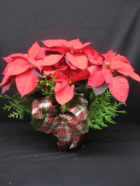 Poinsettia 8 pouces agrémenté de pommes de pin et de sapinage avec cache pot.